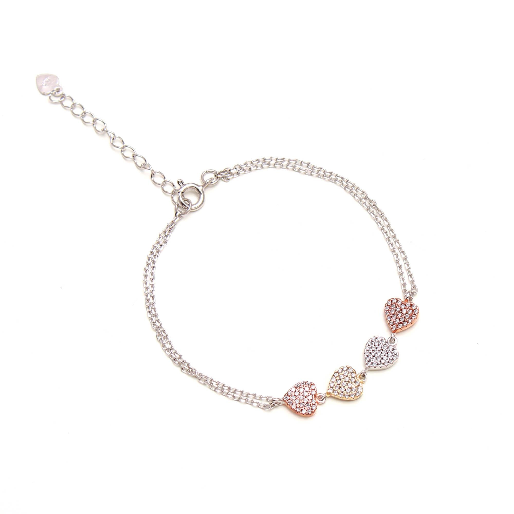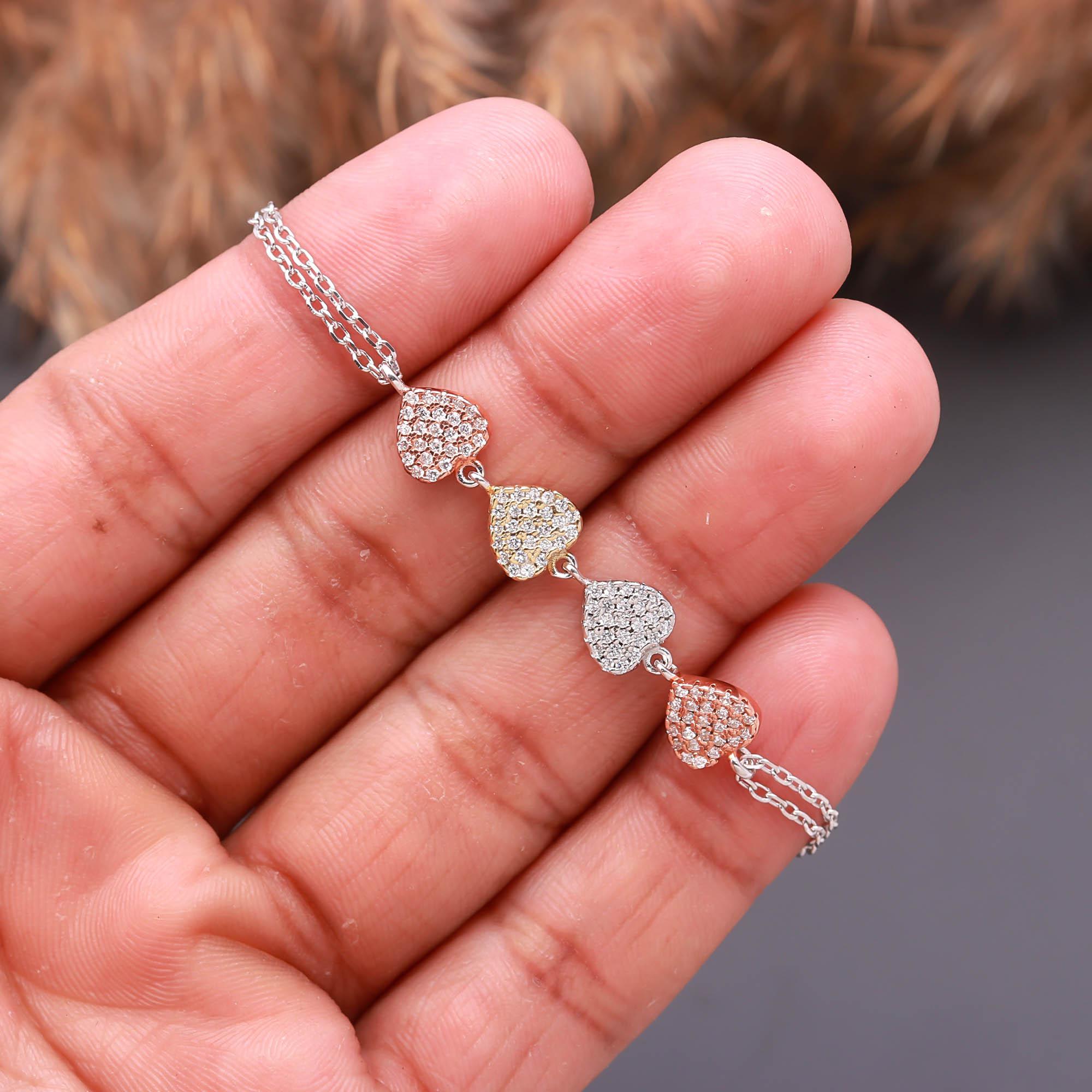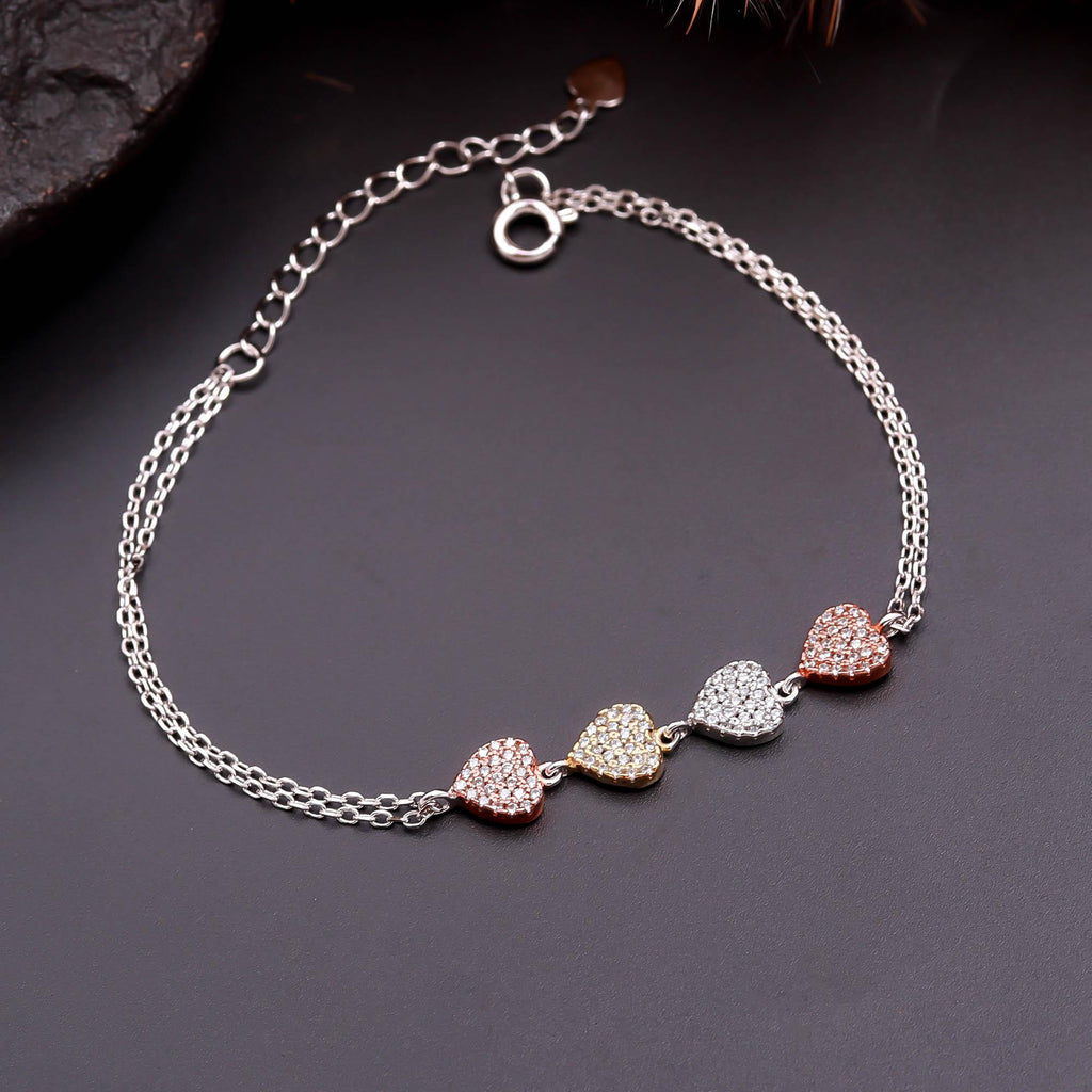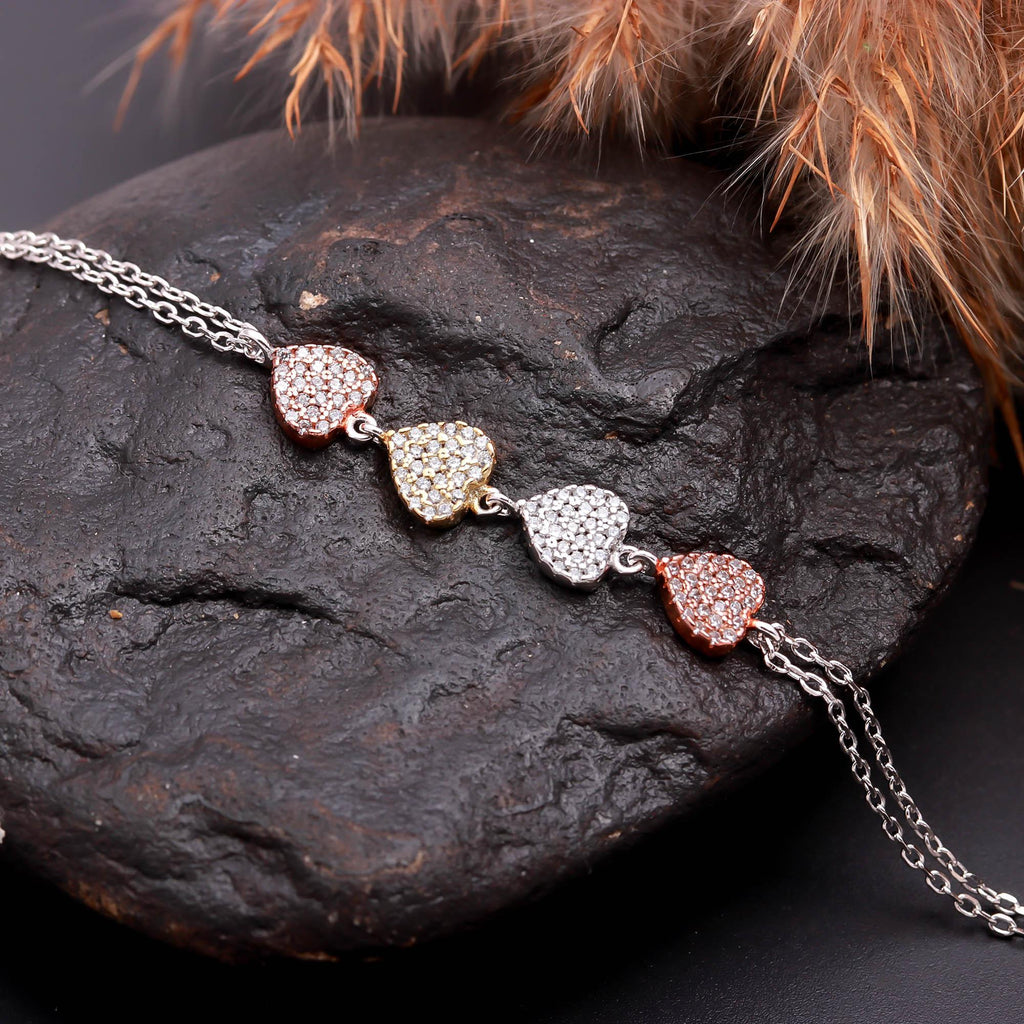 This Multi-Color Heart Charm Bracelet is a vibrant expression of love and style. Featuring beautifully crafted heart-shaped charms in rose gold, gold, silver, and copper tones, it adds a playful yet elegant touch to any look. The polished finish enhances its shine, while the varied colors make it easy to pair with different accessories. Perfect for gifting or personal wear, this bracelet blends warmth, charm, and sophistication in one timeless piece.