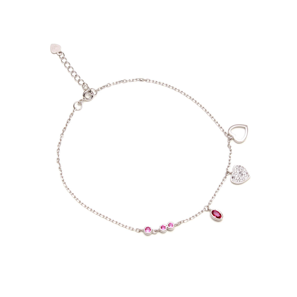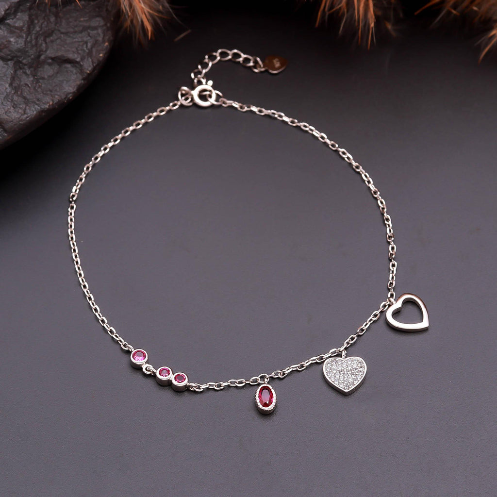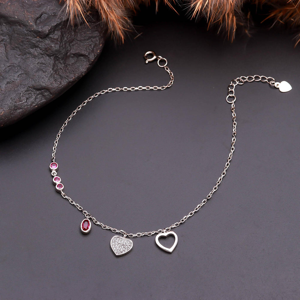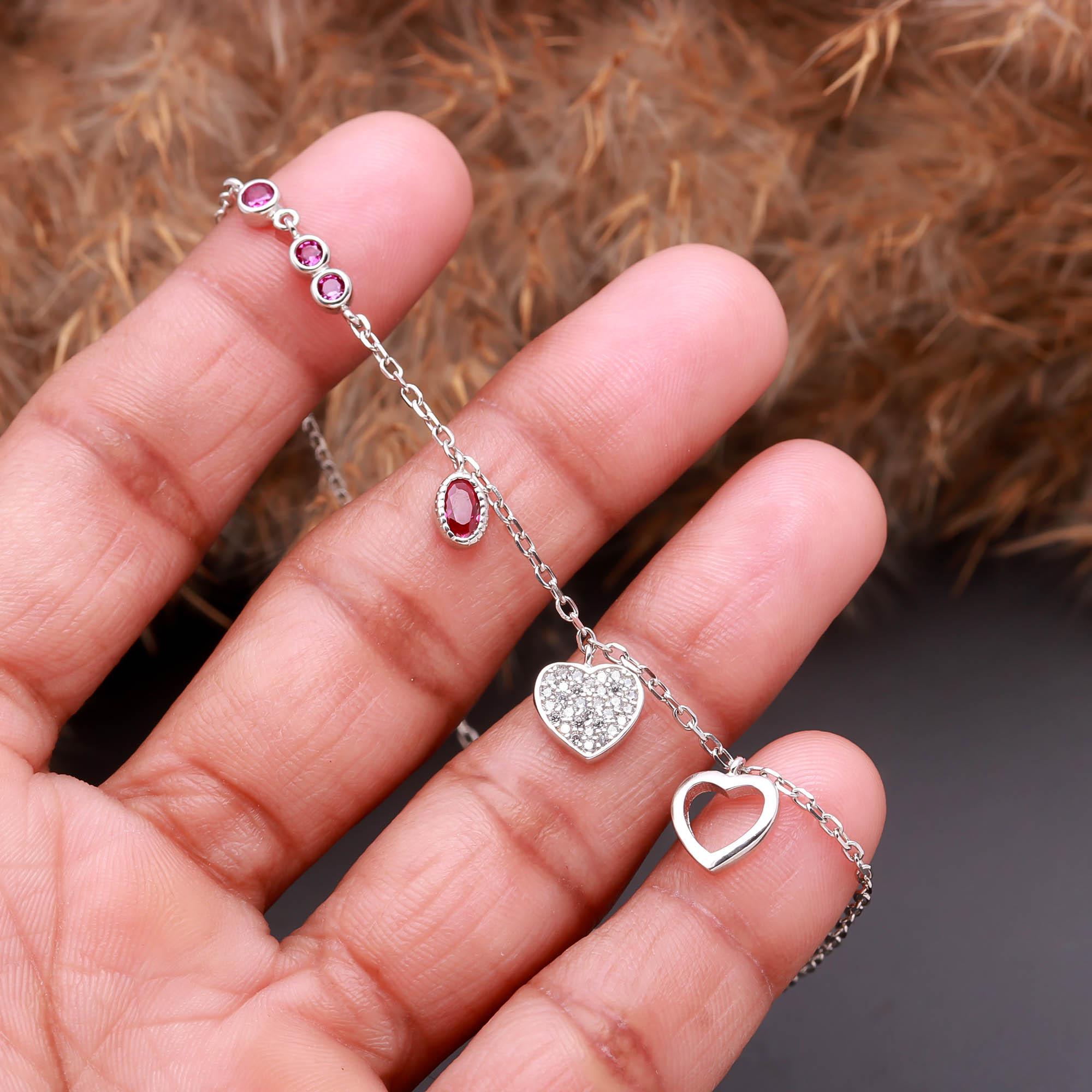 This Silver Heart Charm Bracelet with Red Gemstones is a perfect blend of romance and elegance. The silver chain is beautifully accented with vivid red gemstones, symbolizing love and passion, while the heart-shaped charm adorned with clear stones adds a touch of sparkle. Crafted with precision and polished for a radiant finish, this bracelet makes a stunning accessory for any occasion — from casual outings to special celebrations.