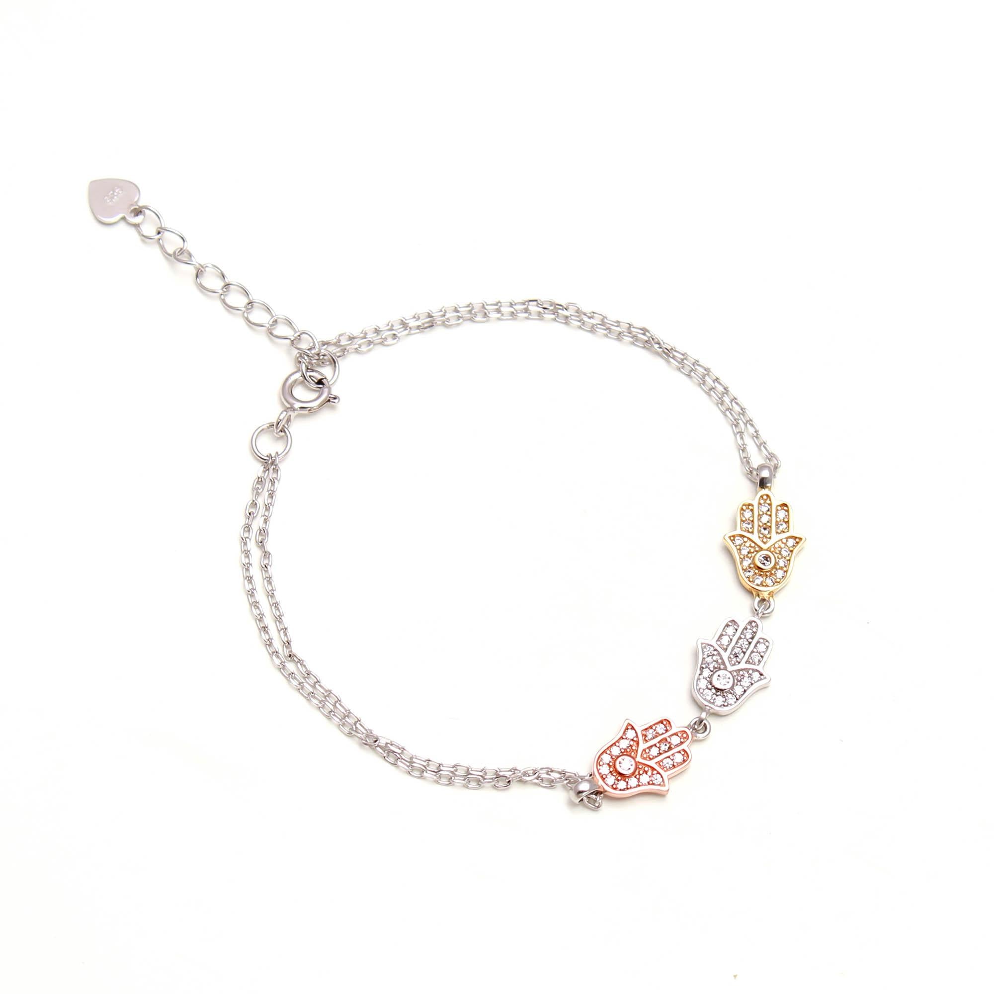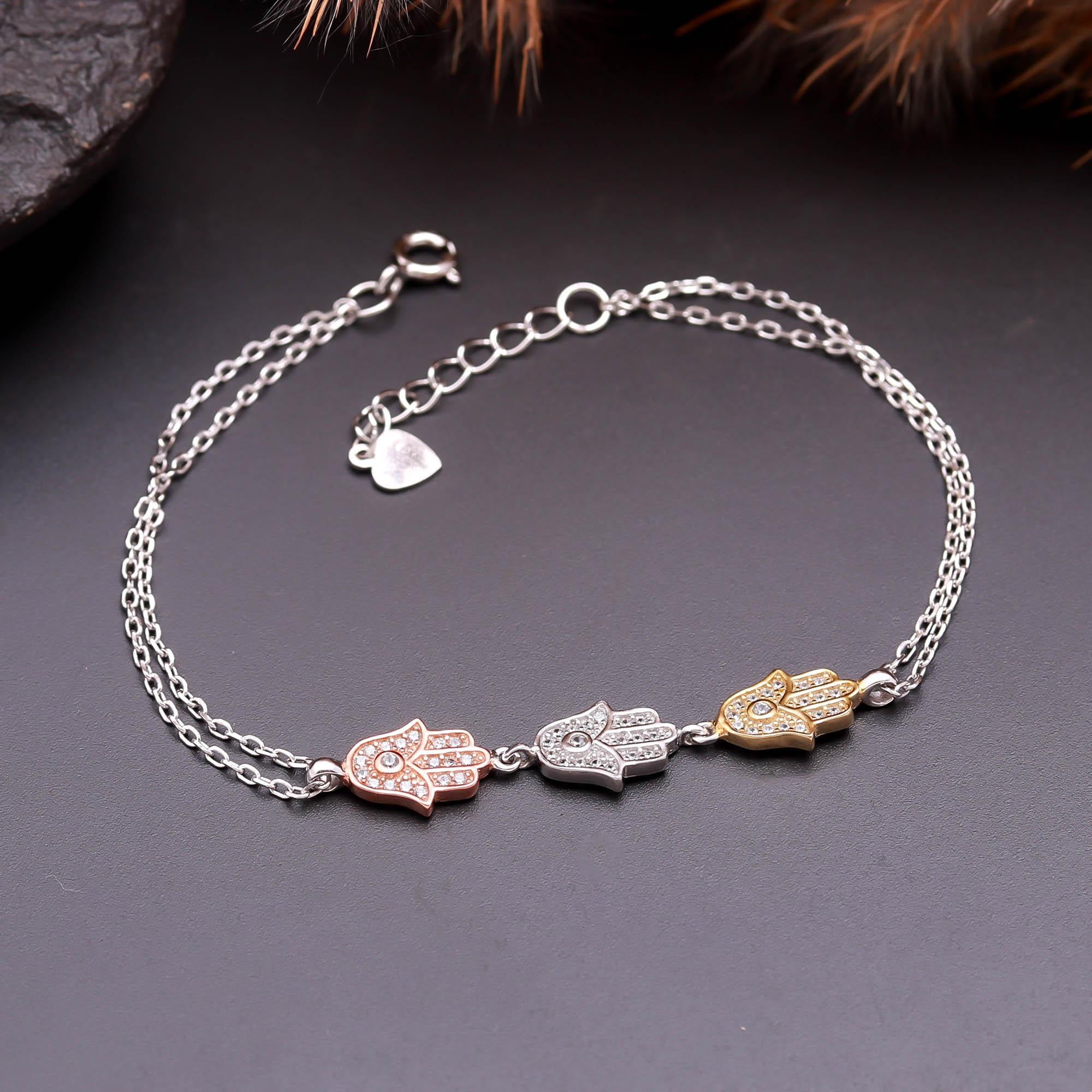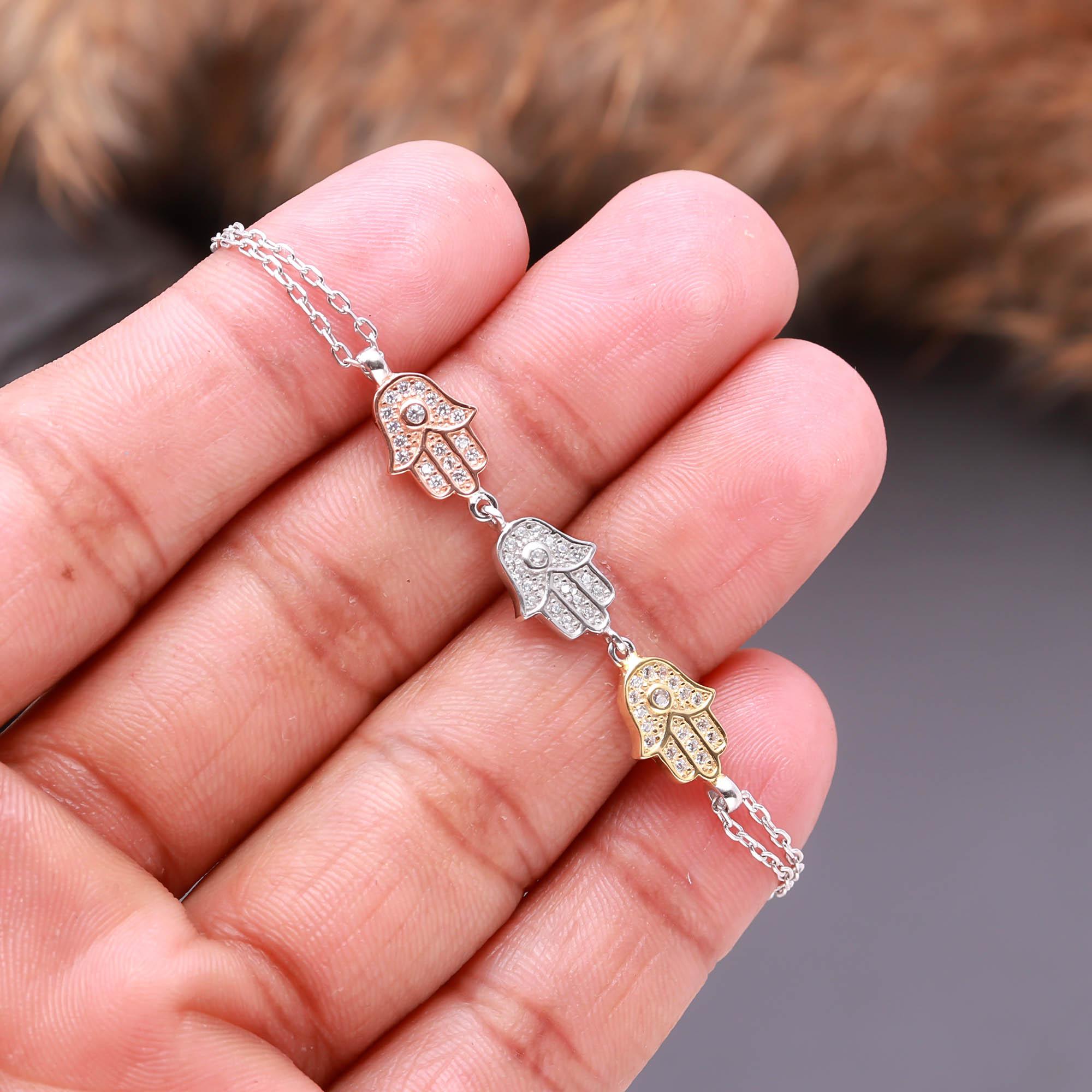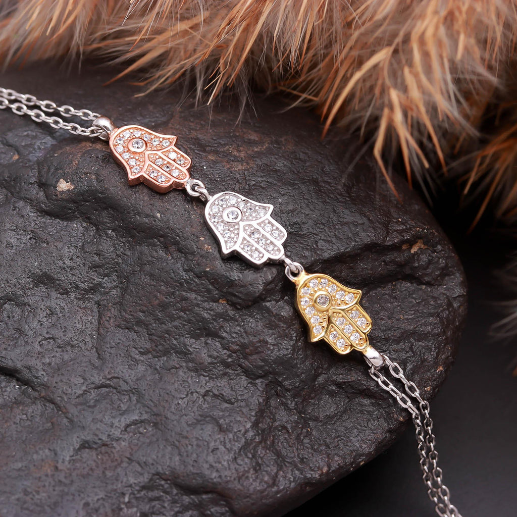 This Triple Hamsa Hand Charm Bracelet is a stunning piece that blends elegance with spiritual symbolism. Each Hamsa charm — in rose gold, silver, and gold — represents protection and good fortune, creating a harmonious and eye-catching design. Crafted with care, the bracelet’s polished finish adds a radiant shine, making it perfect for both everyday wear and special occasions.
