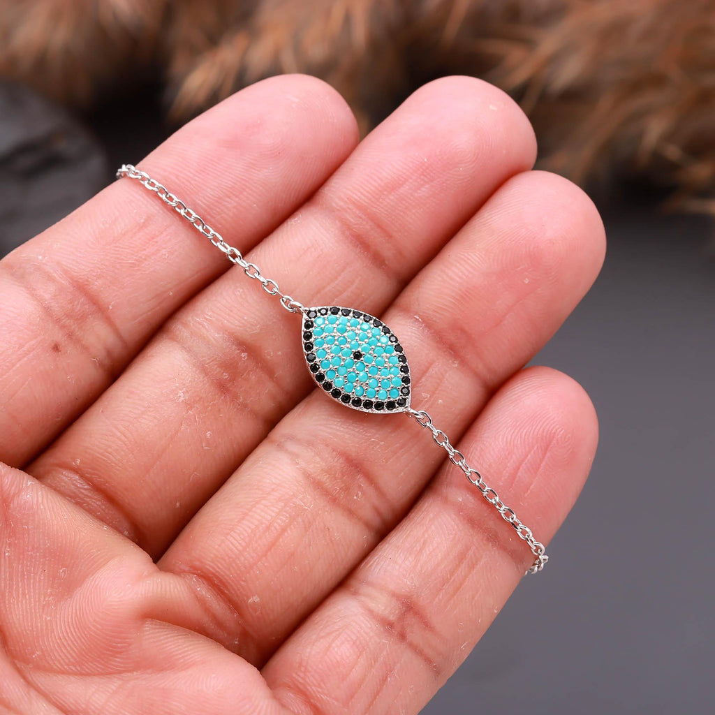 Sterling Silver Chain Bracelet with Turquoise and Black Enamel Eye Design