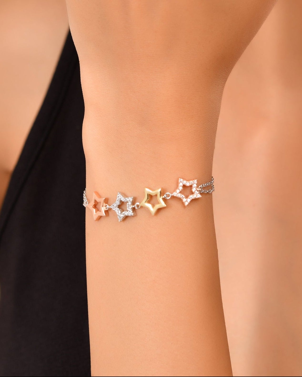 This sterling silver bracelet features a delicately crafted star design adorned with sparkling cubic zirconia stones. Made from genuine 925 sterling silver, it offers both elegance and durability. Its refined craftsmanship ensures a comfortable fit and lasting shine, making it a versatile accessory for daily wear or special occasions.
